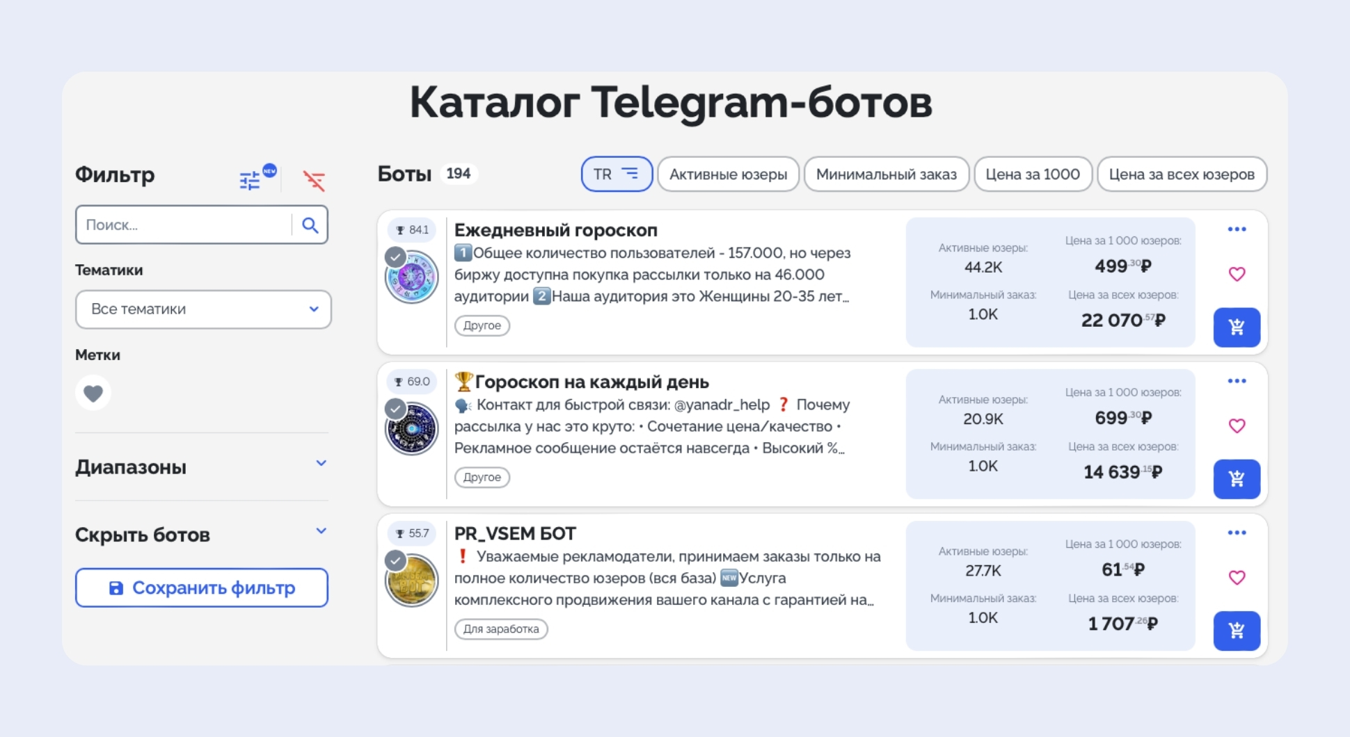 Также в интерфейсе появились удобные функции: можно сохранять подборки ботов, делиться корзиной с коллегами или клиентами — все это упрощает управление рекламой.