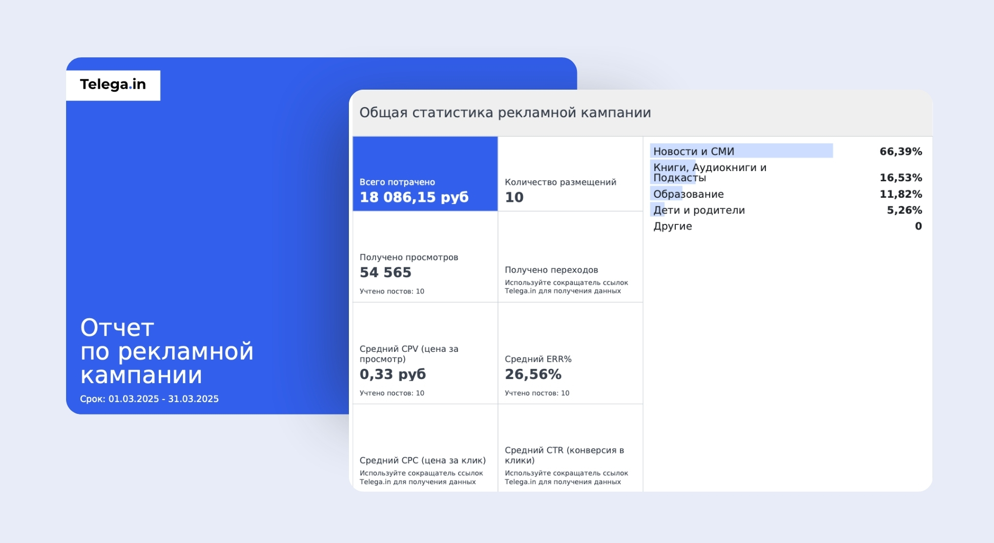 Например, PDF-отчет от Telega.in поможет визуализировать показатели кампании для клиентов агентств. Он оформлен как презентация — четко, структурно, с наглядными визуализациями.