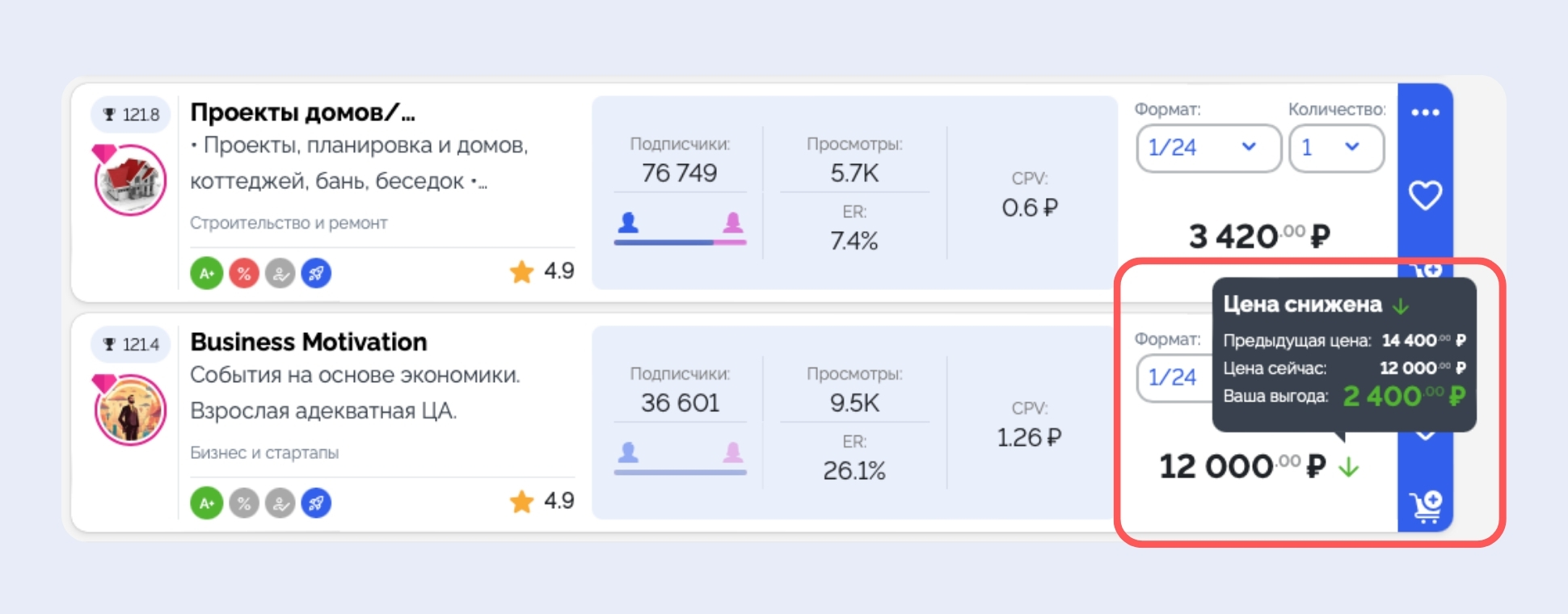 Автоматическая отметка сниженной цены. Если цена размещения в канале снижена на 15% и более, в каталоге появляется зеленая стрелка и подсказка.