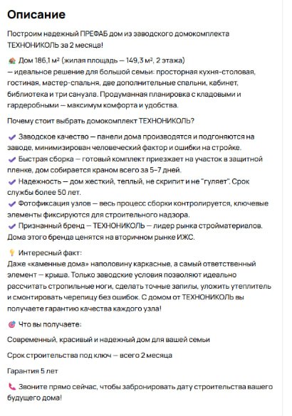 создание подробных описаний для объявлений в категории «Услуги строительства»: мы старались ярко показать преимущества домов, обозначить важные для клиентов детали и отработать возражения, чтобы они сразу могли увидеть нужную информацию о сроках возведения и надежности технологии и застройщика без дополнительных уточнений;