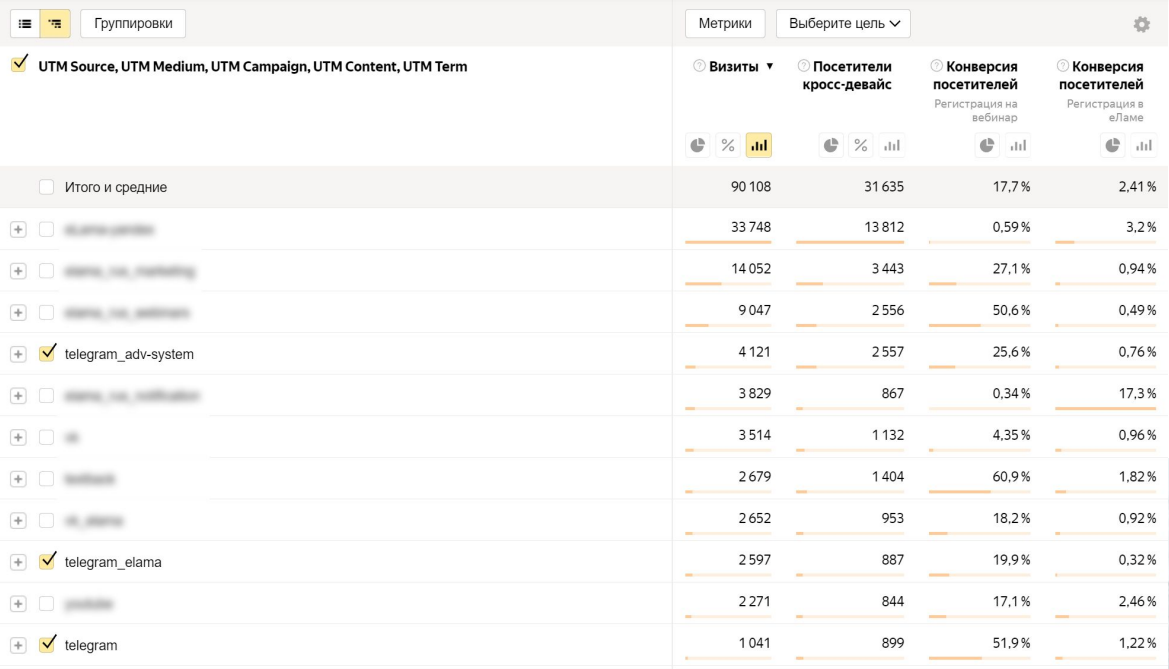 Если важны конверсии на сайте, то к ссылке, ведущей на сайт, нужно добавить UTM-метки. Так оценивать количество и качество трафика, в том числе достижение целей, вы сможете в системах аналитики, например, в Яндекс Метрике или сервисах сквозной аналитики. Несколько таких сервисов — ROMI center и Roistat— доступны бесплатно клиентам eLama.