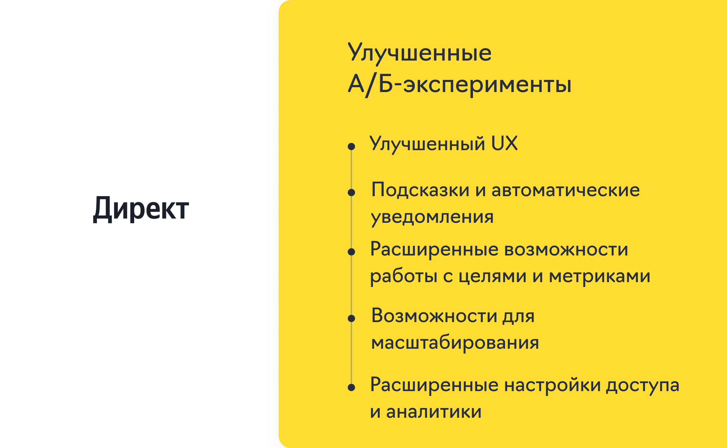 В Директе Про вышли из беты улучшенные А/Б-эксперименты. В них можно запускать до 50 экспериментов одновременно и быстро добавлять дополнительные. Инструменты теперь доступны как из меню «Библиотека», так и напрямую из настроек рекламных кампаний и списка всех кампаний. Также расширились возможности работы с целями и метриками — можно выбрать несколько целей одновременно и использовать метрику ДРР.