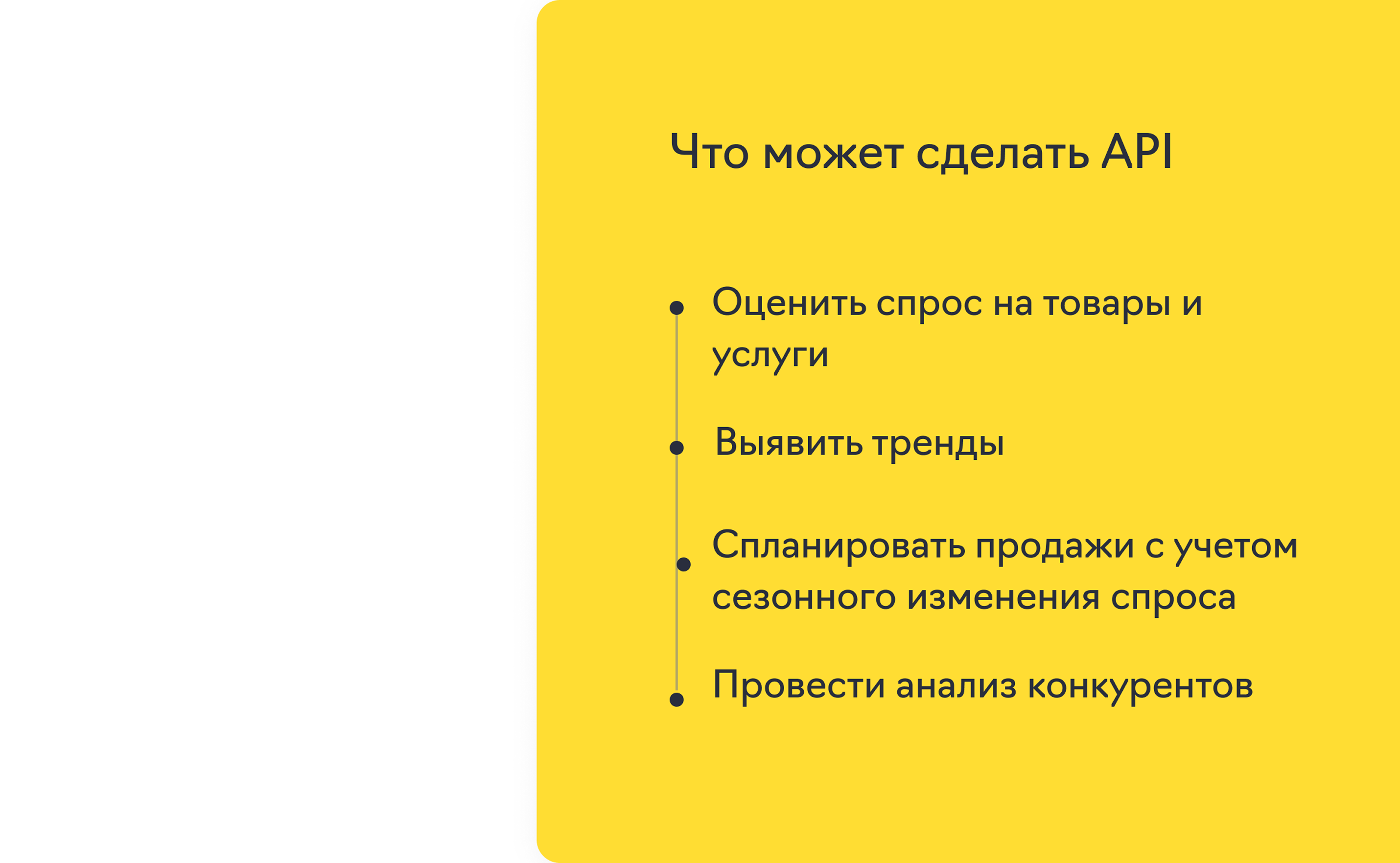 Яндекс представил бесплатный API для Вордстата. С его помощью можно узнать, как часто пользователи ищут компании конкурентов или как меняется спрос на разные категории товаров и услуг. Также сервис показывает ключевые слова для настройки рекламы. Бета-версия API Вордстата уже доступна по заявке.