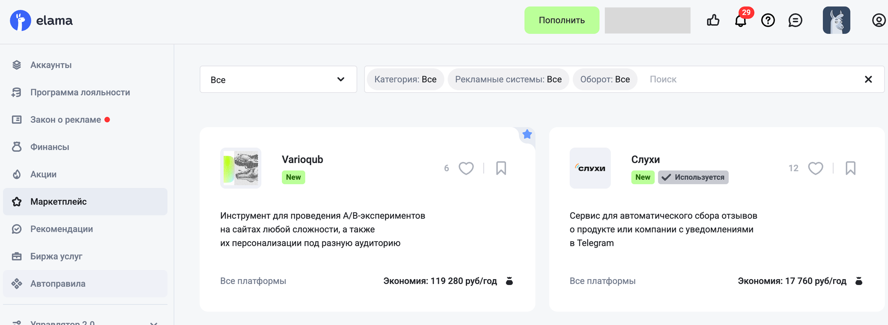 На маркетплейсе eLama появились инструменты Вариокуб Varioqub и «Слухи»