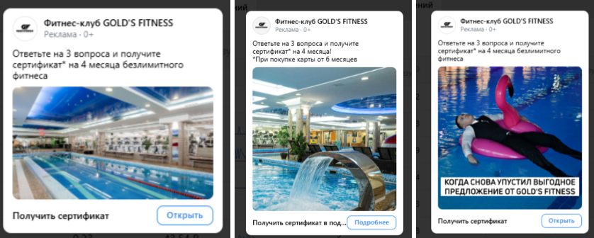 Далее мы добавили в продвижение геймифицированный подход: пользователям нужно было ответить на три вопроса, чтобы получить сертификат на четыре месяца безлимитного фитнеса.
