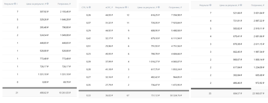 - Пересобрали интересы и ключевые фразы: проанализировали рекламные кампании и выделили ключевые фразы, которые приносили заявки. Затем объединили их в одну целевую группу и запустили на нее отдельную кампанию, чтобы сконцентрировать бюджет на работающих запросах.
