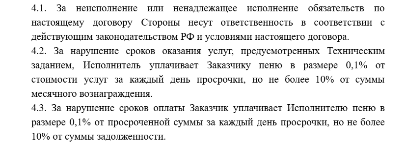 1. Ответственность за нарушение сроков. Если вы задерживаете запуск или сдачу отчетности, заказчик вправе требовать неустойку. Размер и порядок начисления неустойки лучше определить заранее — это делает условия прозрачными и позволяет сторонам понимать финансовые последствия просрочки.