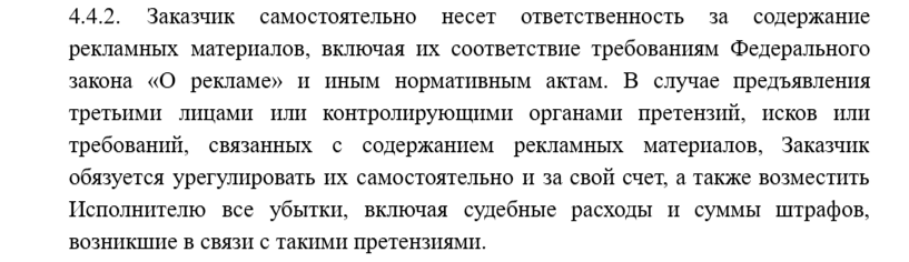 Ответственность сторон — «что будет, если». Это порядок действий в любых нестандартных ситуациях и спорных моментах. Что делать, если заблокируют рекламный кабинет, или кто виноват, если реклама нарушит чьи-то права.