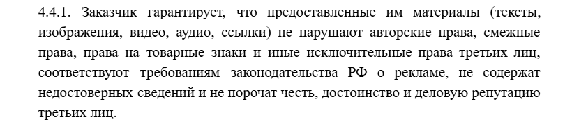 Отдельно стоит указать, что заказчик гарантирует наличие прав на используемые объекты и соответствие рекламных утверждений действительности. Это позволит заранее определить порядок распределения рисков при возможных блокировках или штрафах.