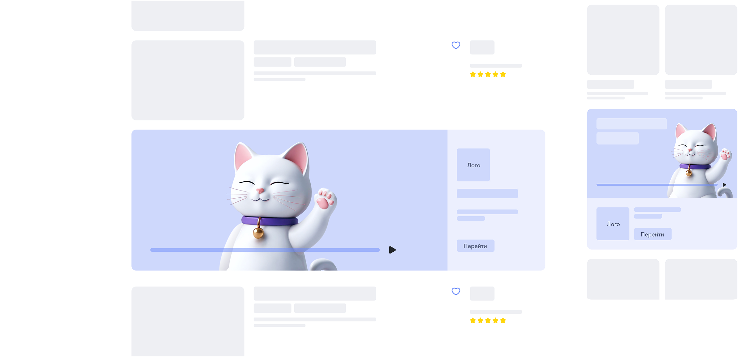 Адаптивный баннер, который может анимироваться и реагировать на действия пользователя. Благодаря этому формат выглядит живее обычных баннеров, лучше выделяется в ленте и эффективнее привлекает внимание к вашему предложению.