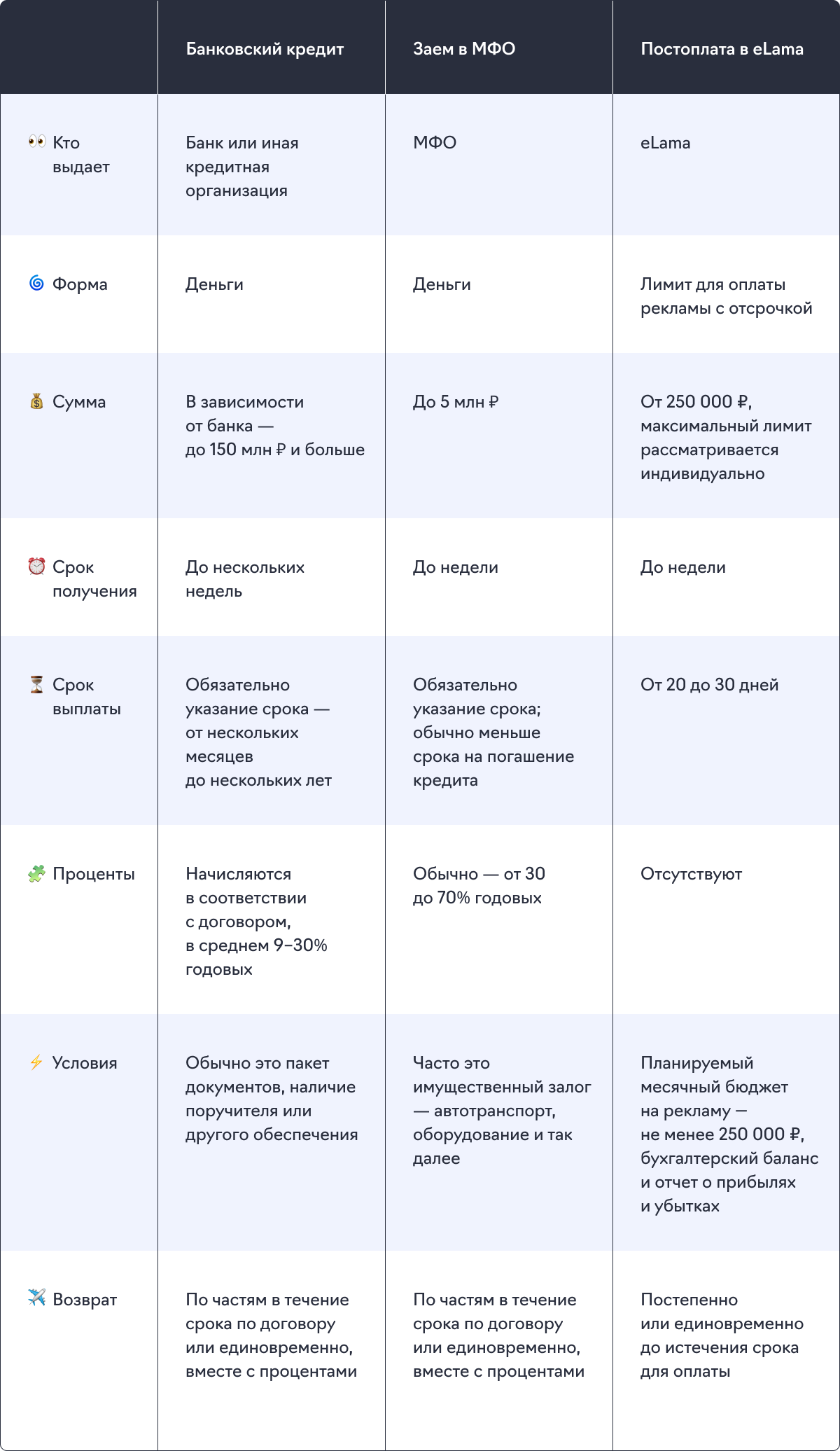 Однако срок оплаты услуг, оказанных на условиях отсрочки платежа, скорее всего будет меньше, чем срок возврата кредита, а лимит можно будет потратить только на рекламу — без возможности перераспределения. Так что выбор в любом случае определит ваша стратегия развития бизнеса.