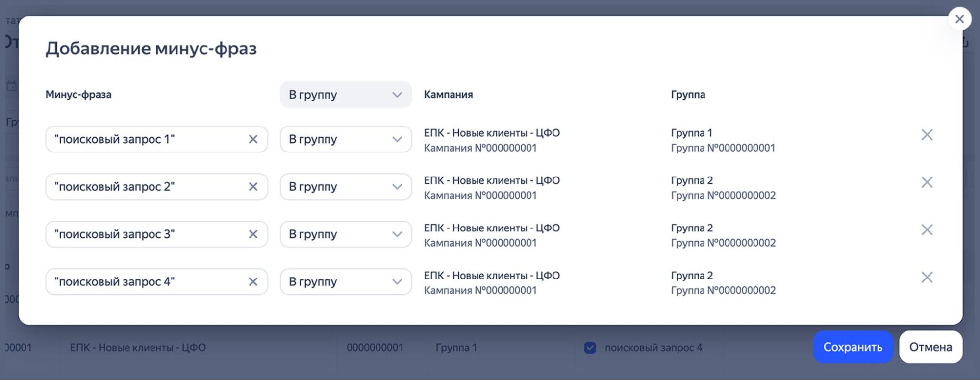 Больше никаких загрузок и перелистывания отдельных страниц, как это было в старом Мастере отчетов. Сначала собрали все запросы, затем выбрали в них конкретные минус-фразы. Кстати, с объединением по группам можно добавить минус-фразы на всю кампанию или конкретно на группу.