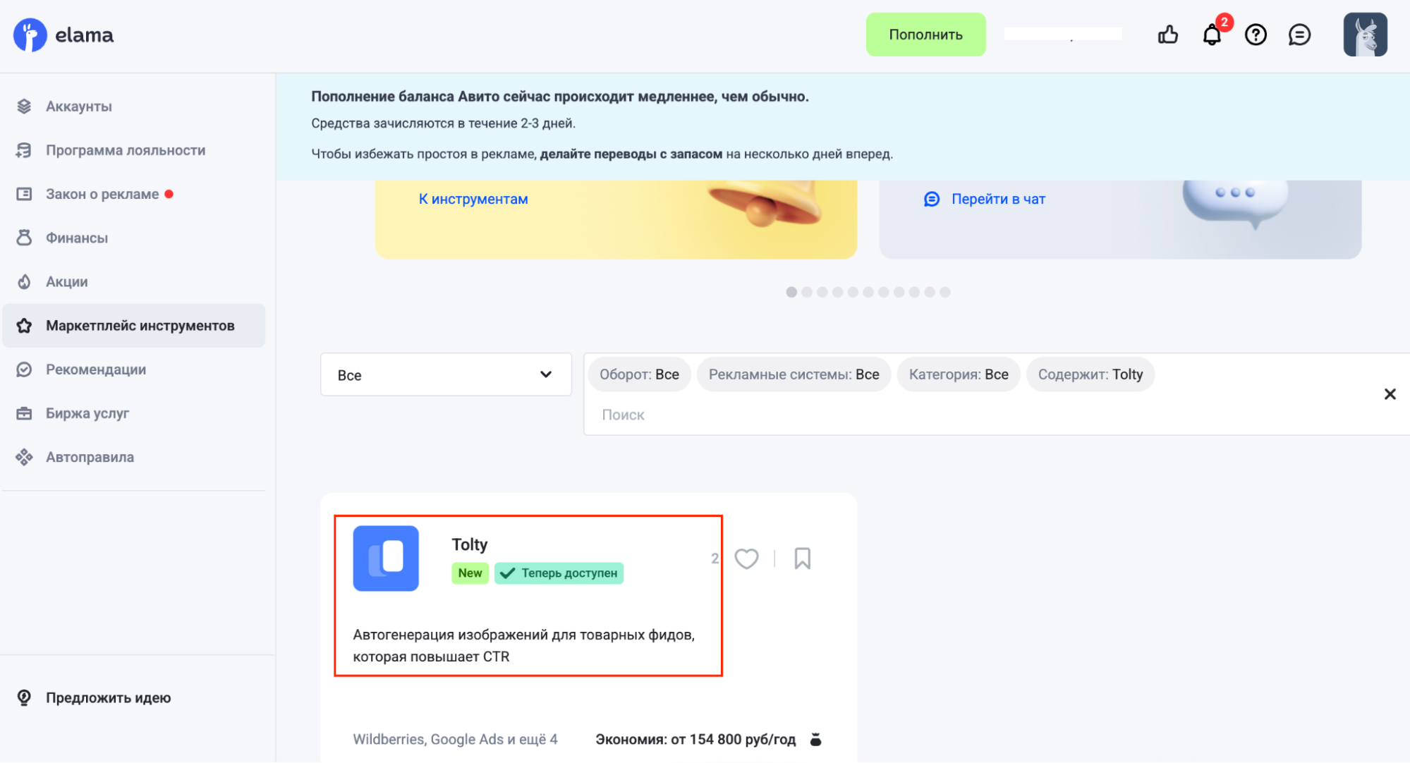 Новый инструмент Tolty на маркетплейсе eLama