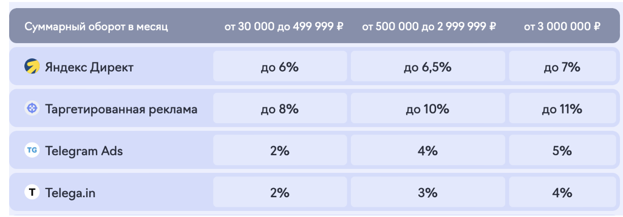 Вознаграждение рассчитывается в зависимости от суммарного оборота по Telega.in: