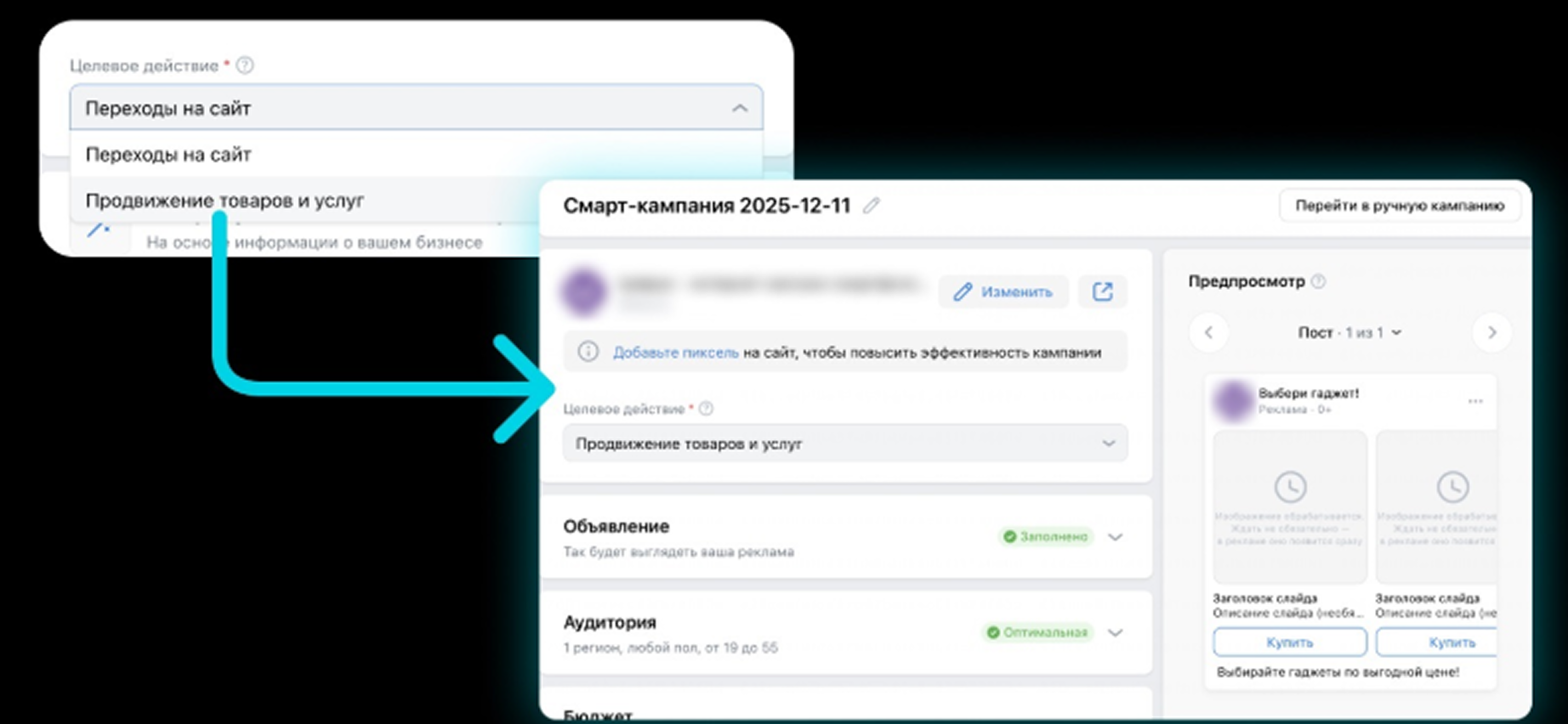 Вы задаете, что продвигаете, выбираете цель, а система сама собирает базовые настройки, помогает с аудиторией и даже генерирует объявление.