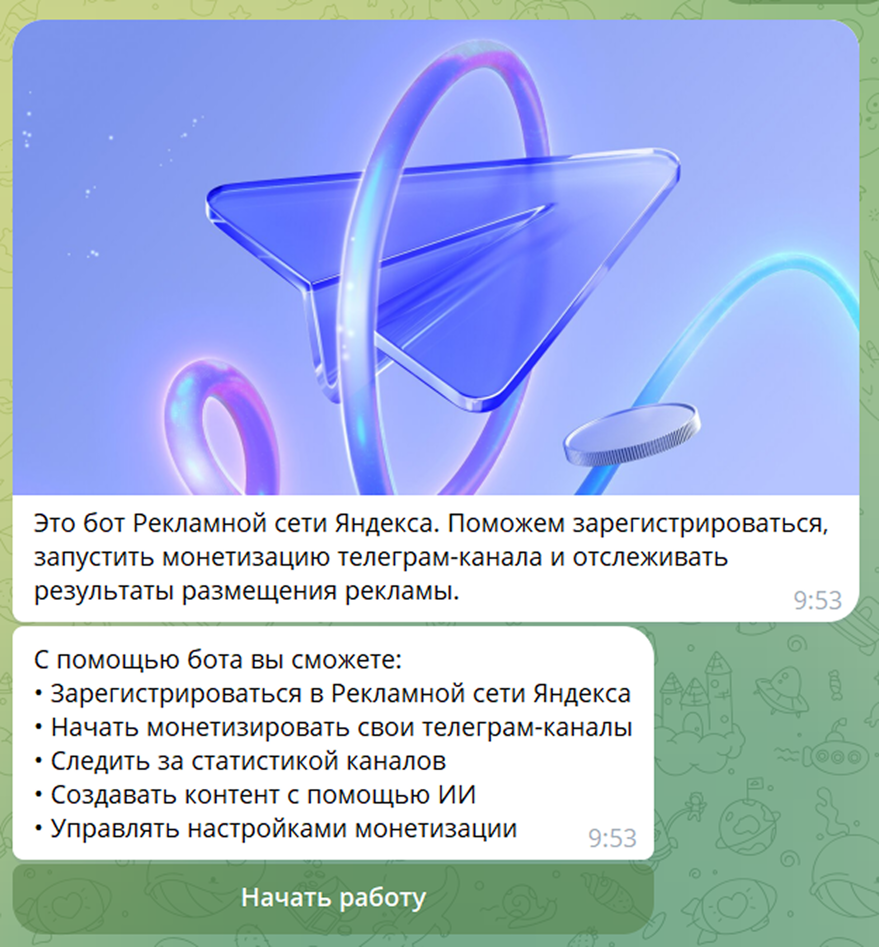 В Telegram появился ИИ-помощник — бот, который работает на нейросетях Yandex Neuro Ads. С ним пользователи могут создавать посты, настраивать монетизацию в РСЯ и находить рекламодателей. А авторам с аудиторией 1500+ подписчиков бот поможет с выходом на рекламный рынок.