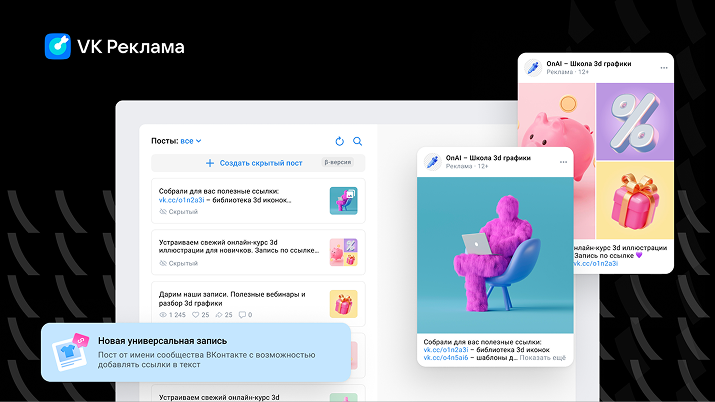 В кабинете VK Рекламы стал доступен формат универсальной записи. С его помощью пользователи могут продвигать объявления с большим объемом текста, добавлять креативы и несколько ссылок без ограничений по их расположению. Баннеры показываются в ленте новостей ВКонтакте. Доступно в бета-версии.