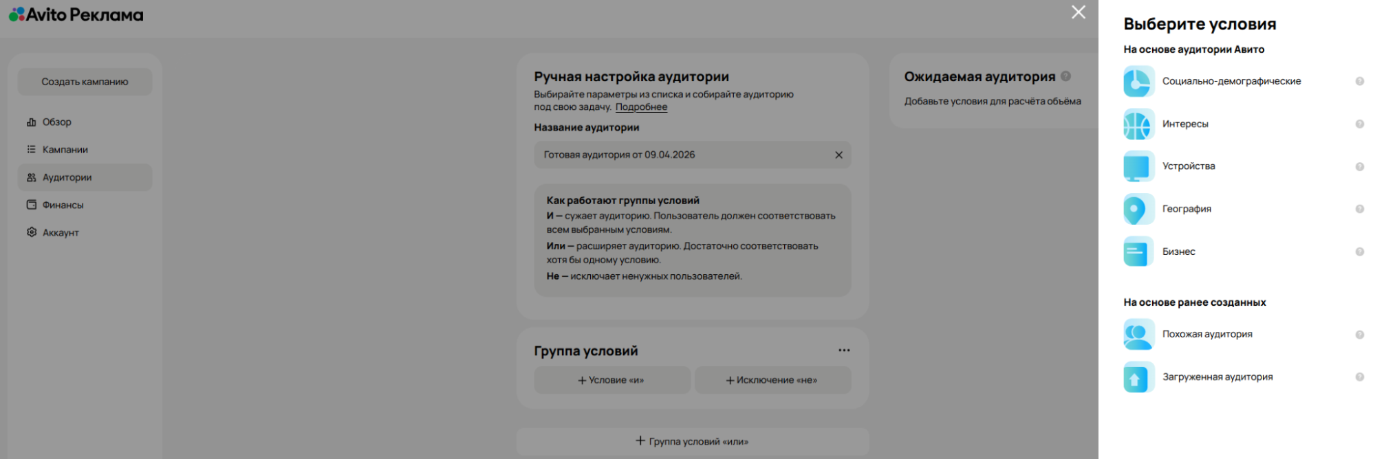 Есть два пути: настроить аудиторию вручную (вкладка «Ручная») или использовать готовую аудиторию, которую вы можете создать самостоятельно или загрузить в готовом виде из CRM-базы в разделе кабинета «Аудитория». Для ручной настройки доступно пять параметров: