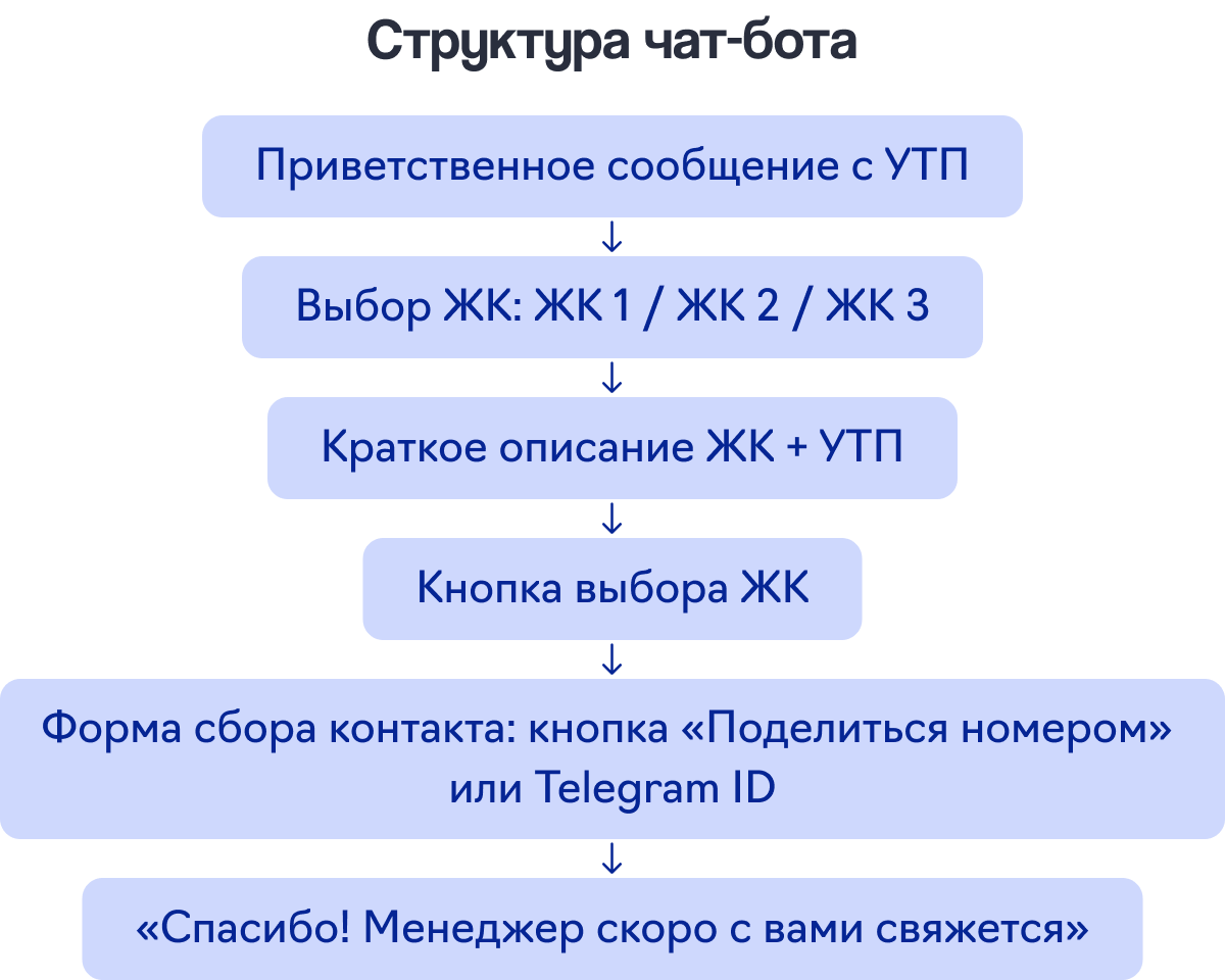 После отправки в боте менеджер получает контакт: имя клиента, указанное в Telegram, ЖК, который он выбрал, номер телефона (если пользователь это разрешил).