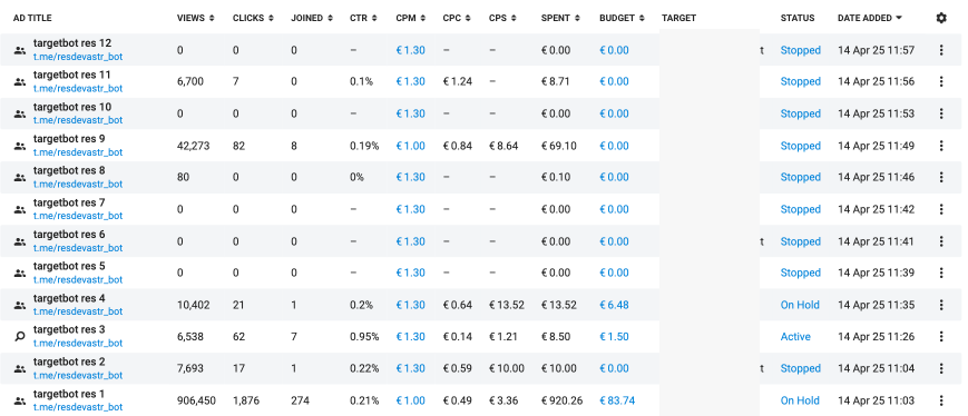 Мы выбрали креативы, которые в предыдущем тесте показали наилучшие результаты, ссылку на сайт заменили в них ссылкой на бот. И за месяц при бюджете 835€ без НДС и комиссий получили такие результаты:
