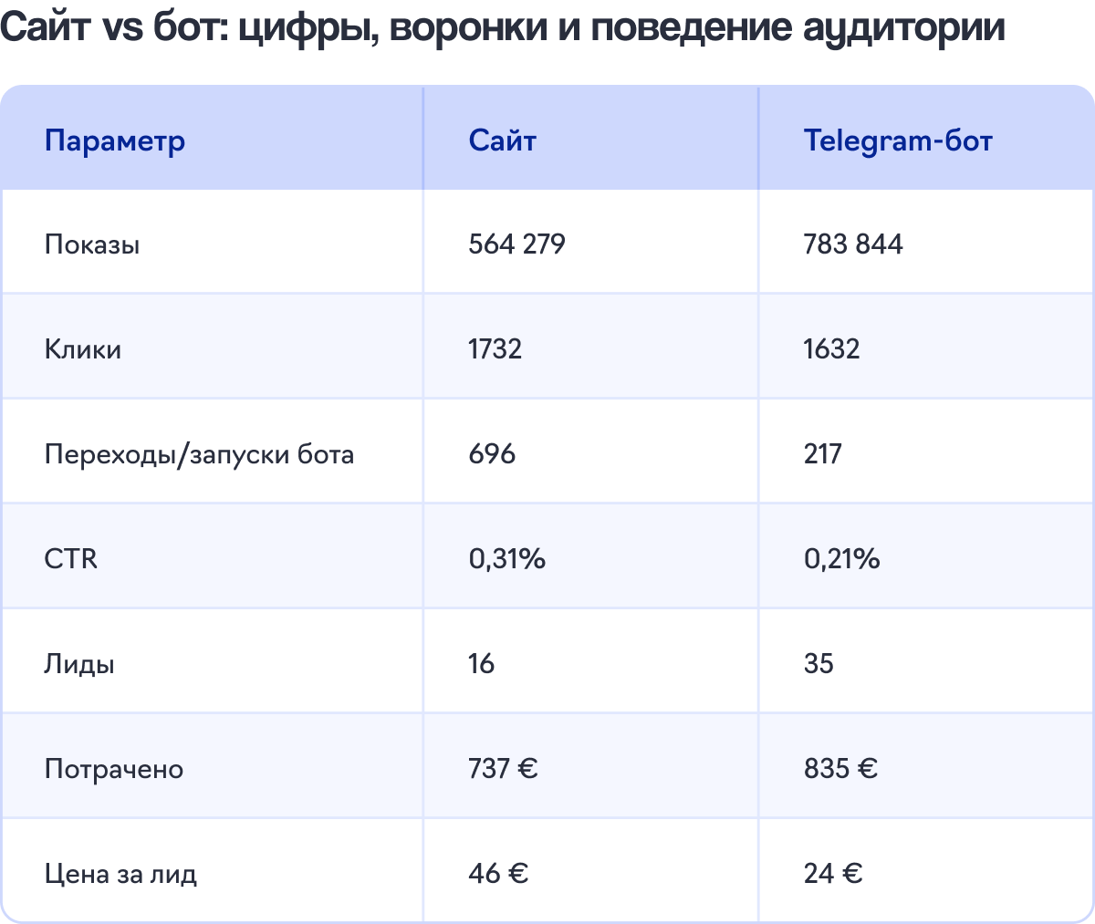 То есть примерно за те же деньги, за которые сайт привел 16 лидов, бот дал в 2+ раза больше — и вдвое дешевле.