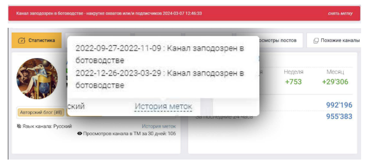 Так выглядят метки о накрутках в сервисе Telemetr