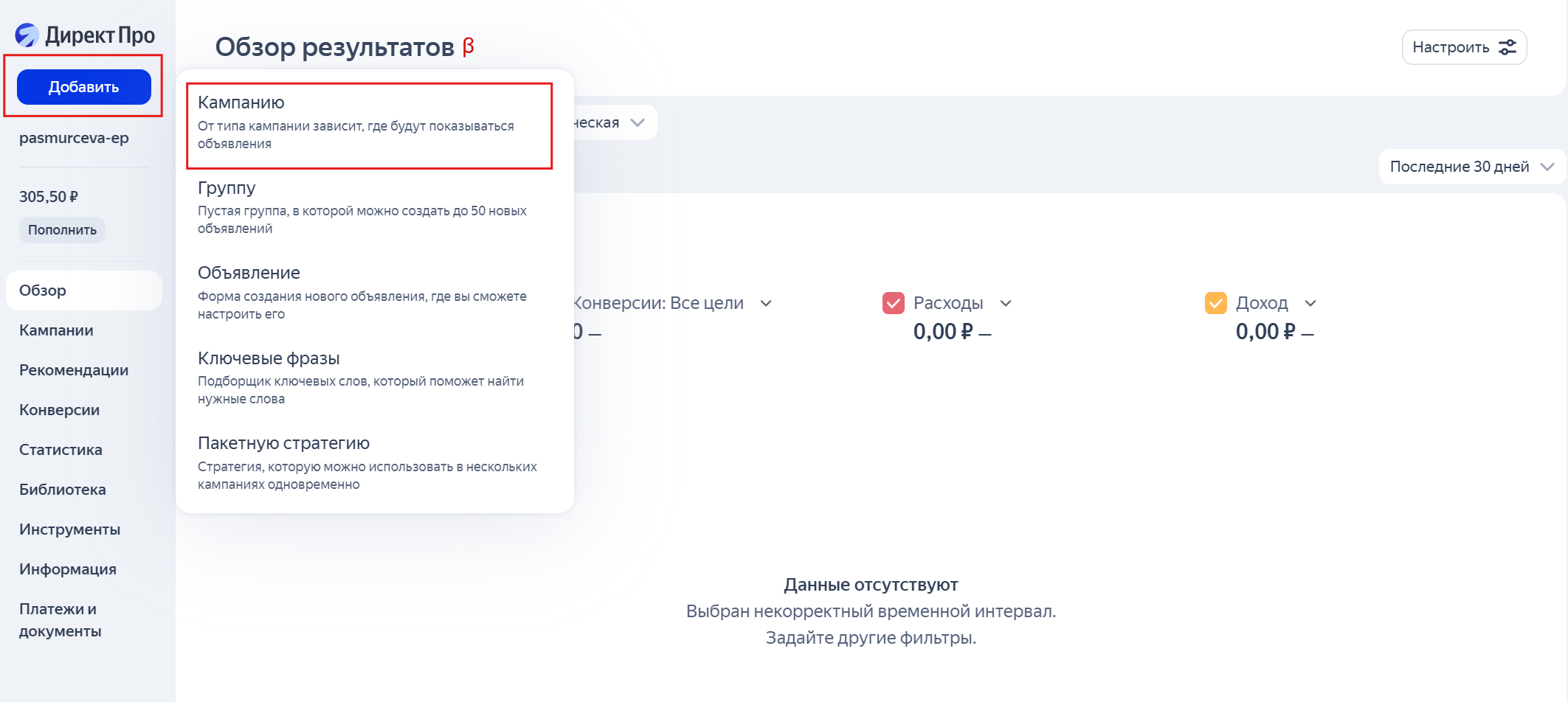 Это упрощенный способ запуска рекламы — большинство настроек здесь автоматимизированы. В Директе кликаем «Добавить» → «Кампанию» → «Мастер кампаний» и выбираем «Конверсии и трафик» или «Товарная кампания».