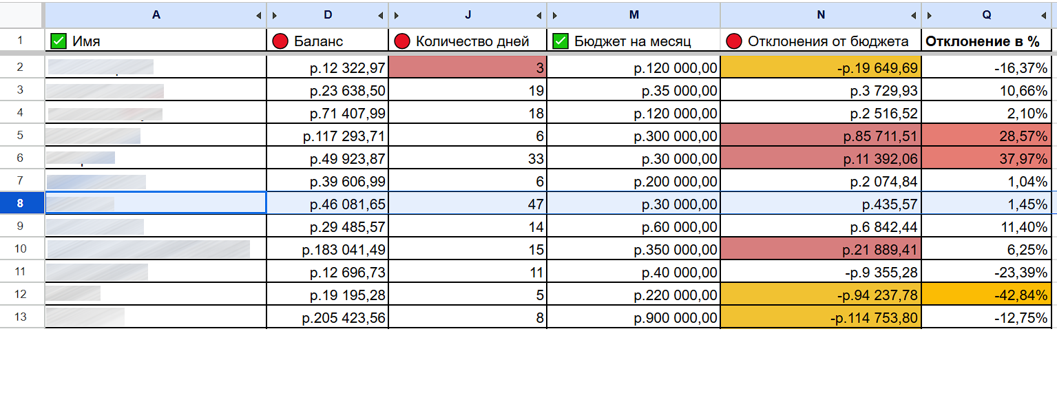 Чтобы контролировать статистику по рекламным кампаниям, мы в агентстве разработали специальную Google Таблицу. В нее через API автоматически подтягиваются финансовые показатели по проектам: фактический баланс, отклонения от запланированного бюджета в деньгах и процентах и количество дней, на которые хватит денег с учетом текущих расходов.