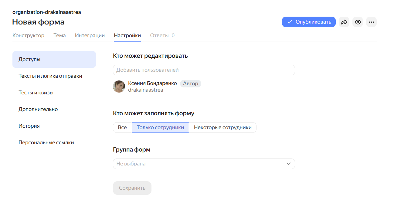 | Доступ к формам | По публичной ссылке для всех | Можно открыть заполнение для всех, ограничить только сотрудниками организации или конкретными пользователями |