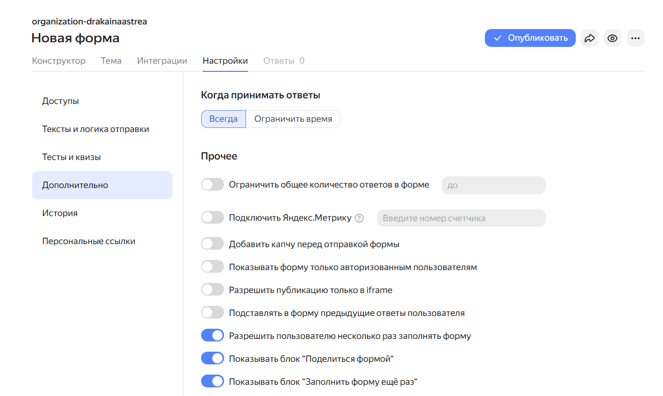 Яндекс Формы предлагают несколько способов поделиться анкетой с аудиторией, а также гибкие настройки доступа, чтобы контролировать, кто и когда может заполнять форму.