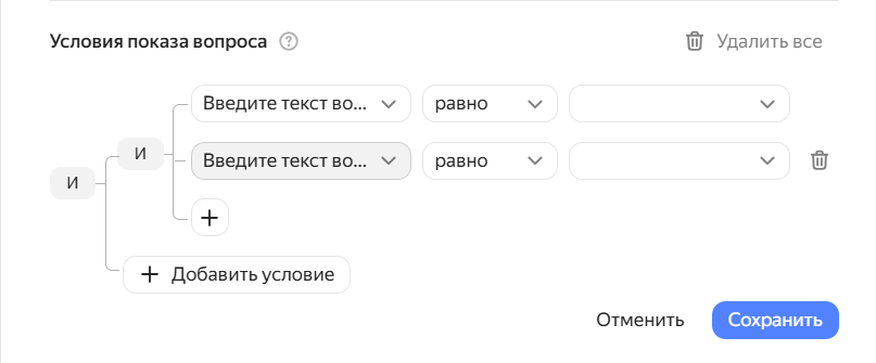 Задайте правило: например, «Показывать следующий блок, если ответ на вопрос 1 равен „Да“».
