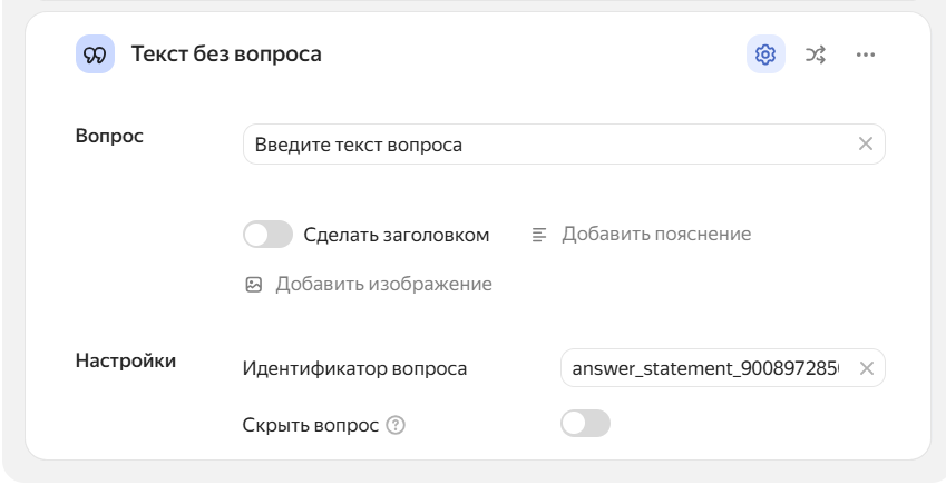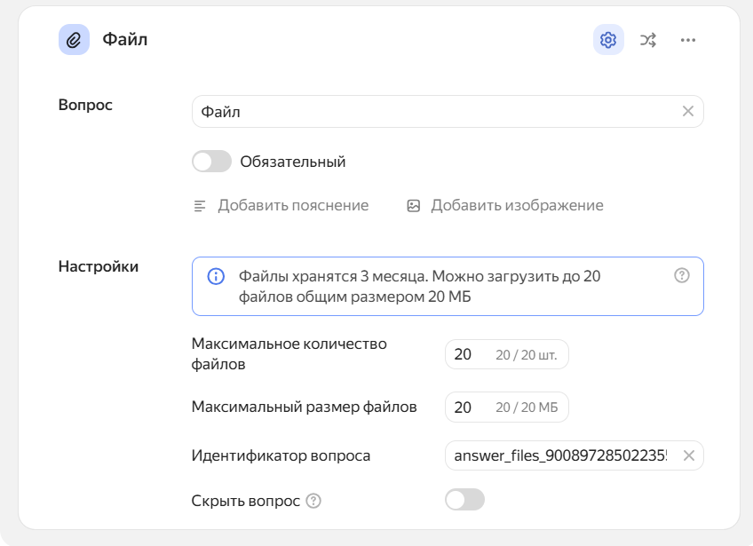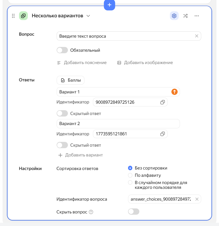 Чтобы вопрос не был виден пользователю, но данные по нему передавались (например, для UTM-меток), включите опцию «Скрытый вопрос».