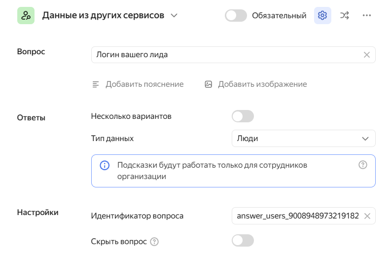 | Специальные вопросы | Нет | Доступны новые типы вопросов: «Люди», «Отделы», «Команды» (выбор из справочника организации), а также блоки «Трекер» и «Вики» |