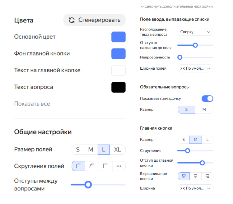 В дополнительных настройках можно кастомизировать расположение самих вопросов и их отступы от края карточки, сделать текст больше или меньше, задать ширину полей и процент скругления.