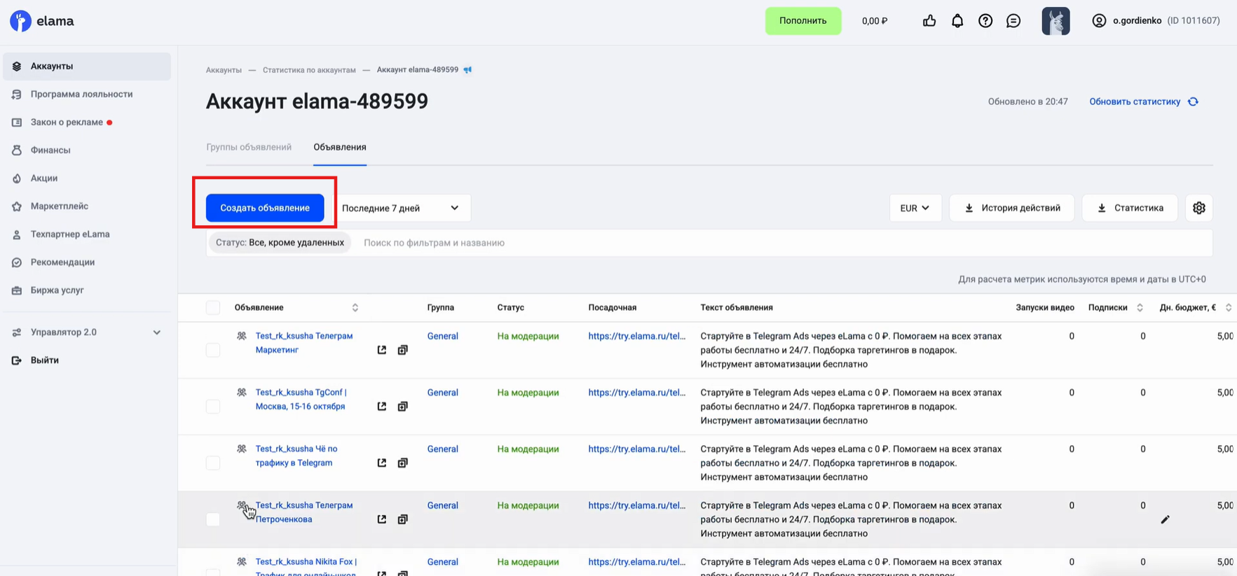 Если у вас еще нет своего аккаунта Telegram Ads в eLama — создайте его.