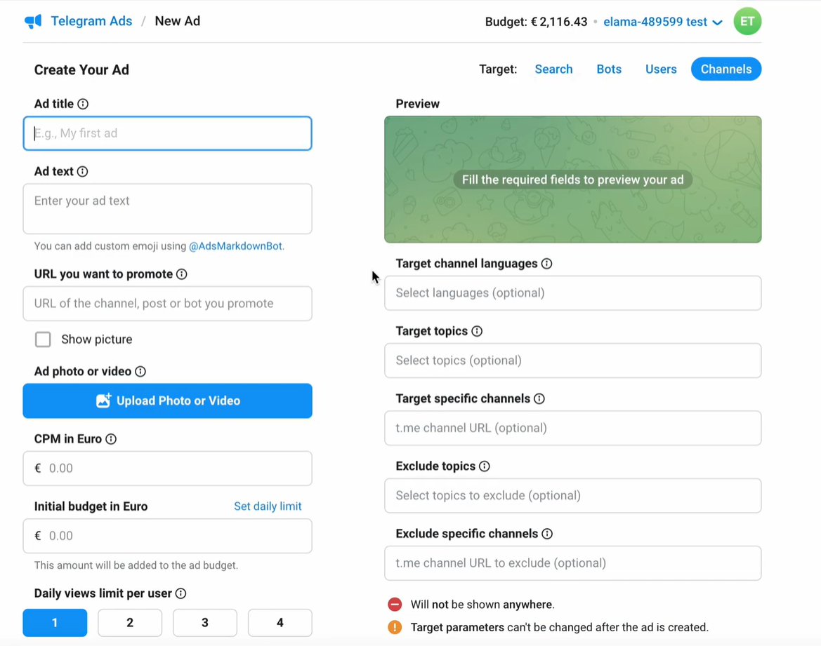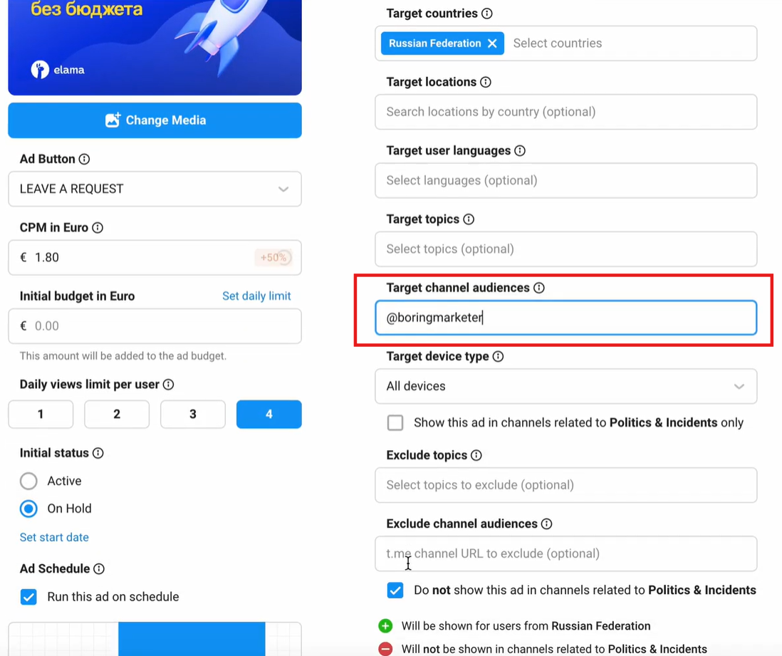 Указать каналы для таргетинга (Target specific channels), где будет показываться объявление. В кабинете Telegram Ads каждый канал при копировании объявления нужно добавлять отдельно, вставить заранее заготовленный список каналов не получится.