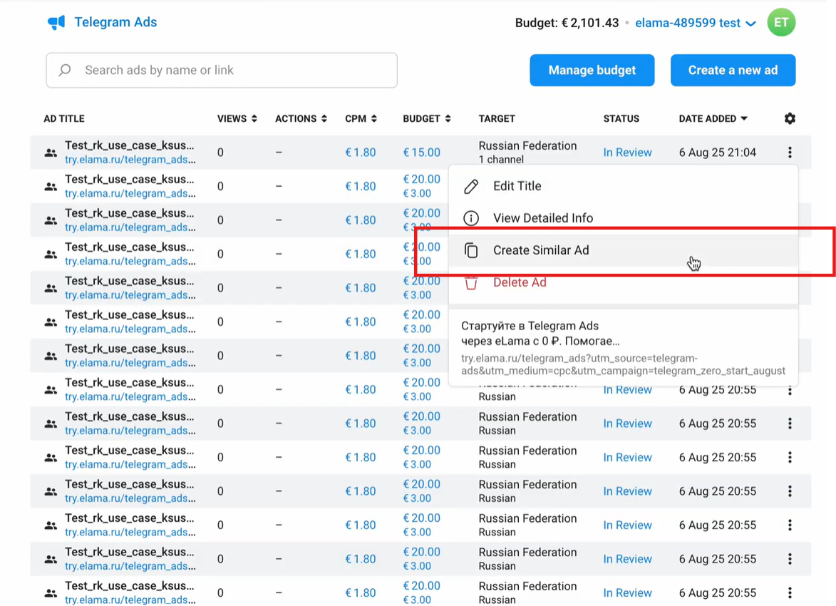 В стандартном кабинете Telegram Ads придется сначала создать объявление для одного канала, а затем вручную копировать его (Create Similar Ad) и заводить дубликаты, меняя в каждом объявлении название и канал для таргетинга.