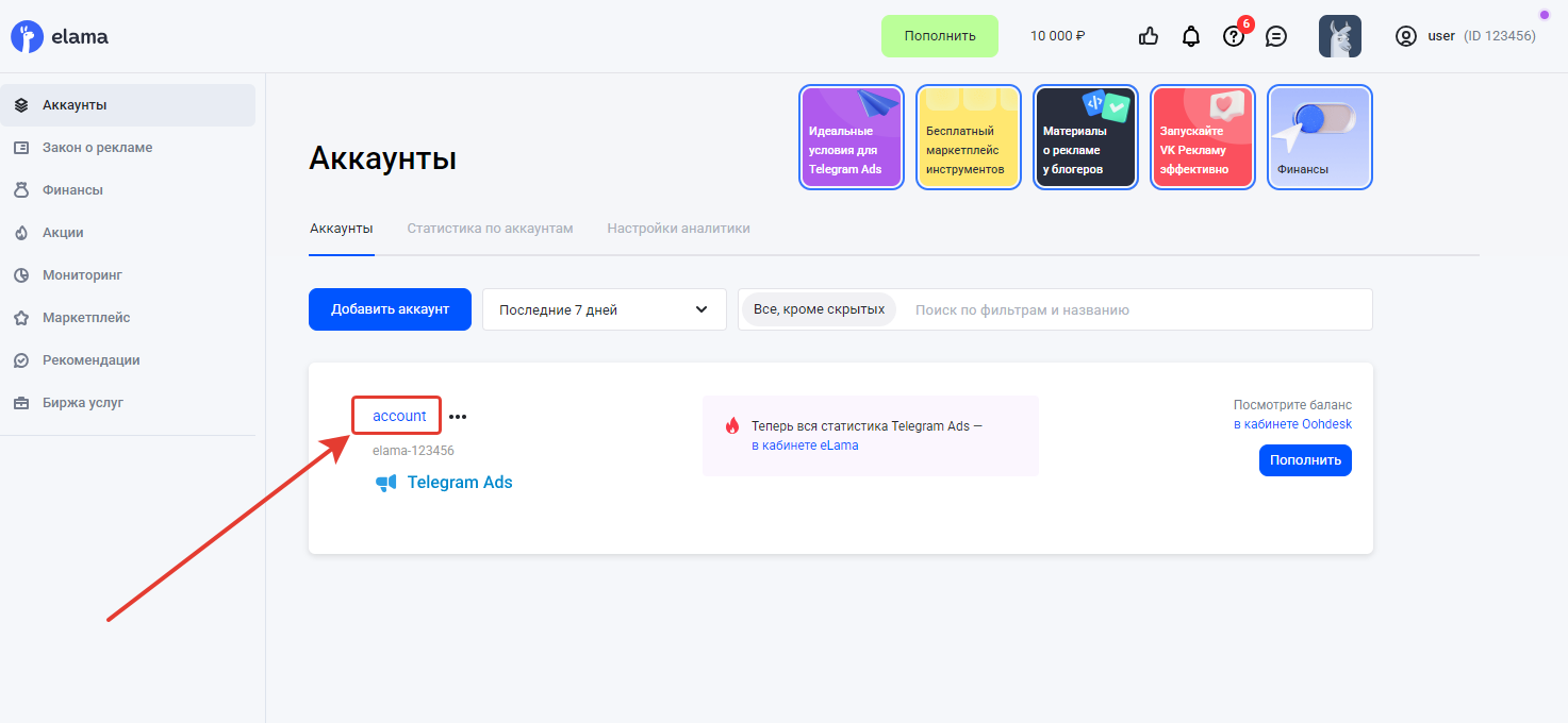 Если у вас еще нет своего аккаунта Telegram Ads в eLama — создайте его.
