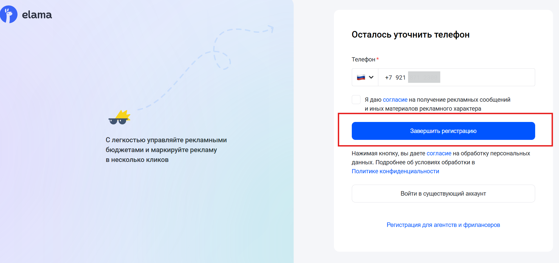 Для регистрации по электронной почте и номеру телефона — укажите их. Если вы хотите экономить на продвижении и не пропускать выгодные акции от eLama, подтвердите согласие на получение рекламных сообщений, поставив галочку в чек-боксе. Затем нажмите кнопку «Зарегистрироваться».