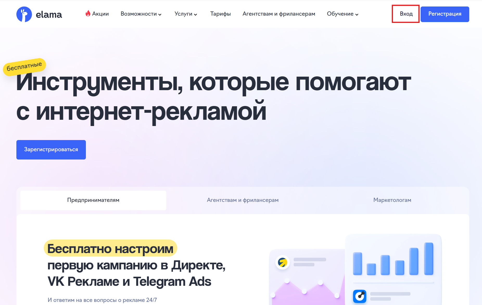 Чтобы войти в уже созданный аккаунт, перейдите на сайт eLama и в правом верхнем углу кликните на слово «Вход».