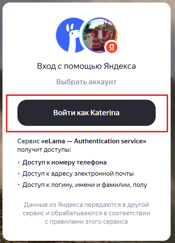 Если вы регистрировались через Яндекс ID, выберите кнопку входа, соответствующую этому варианту. Затем выберите в списке ваших Яндекс-аккаунтов тот, на который зарегистрирован профиль в eLama.
