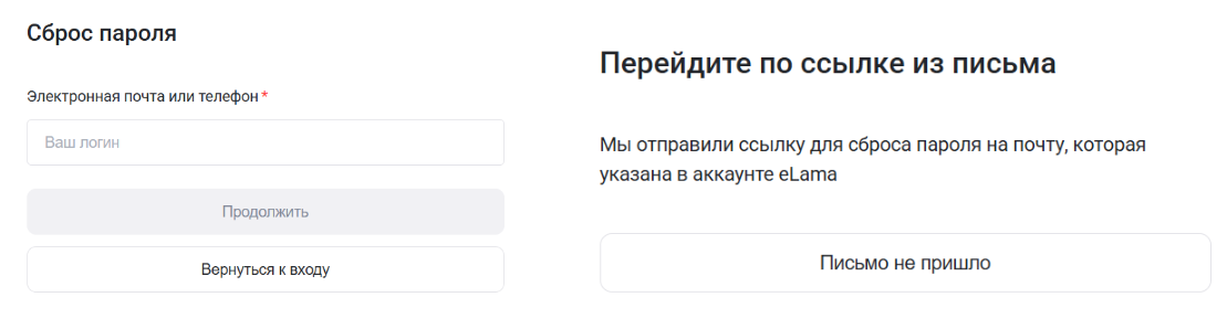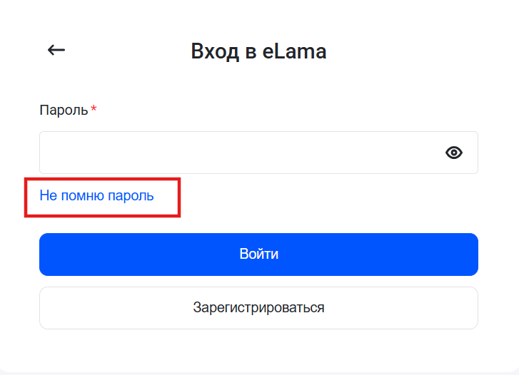 Если вы забыли пароль от личного кабинета eLama, в окне входа выберите пункт «Не помню пароль».