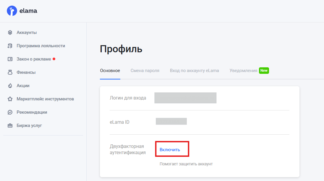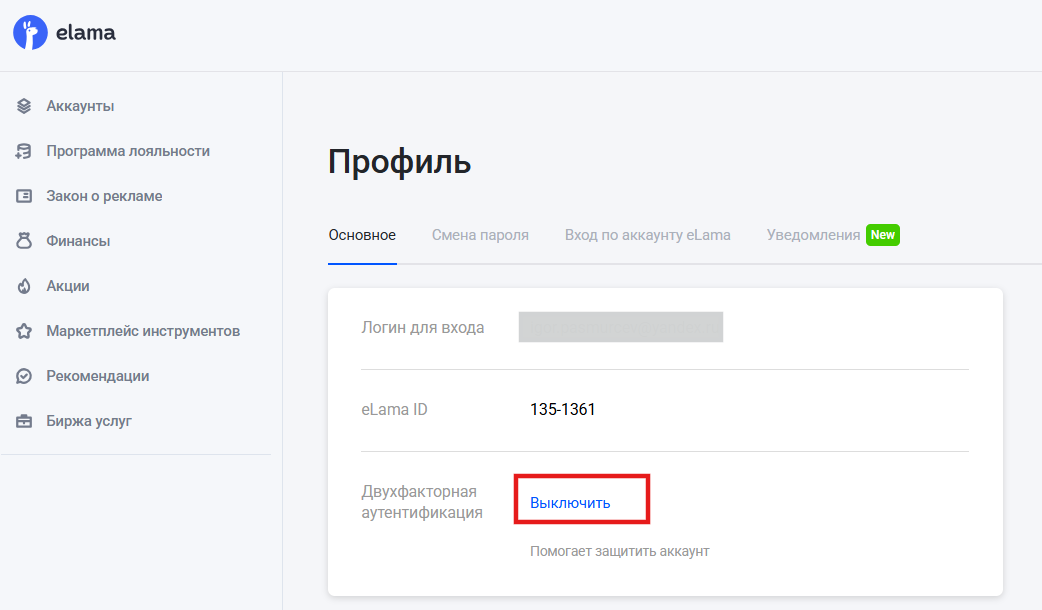 Двухфакторную аутентификацию при желании можно отключить. Для этого можно обратиться в Службу заботы eLama или сделать это самостоятельно: