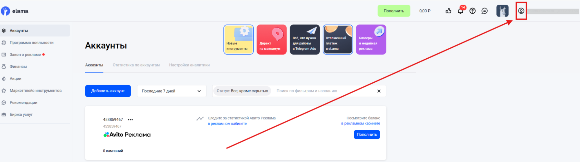 В личном кабинете нажать на значок профиля в правом верхнем углу экрана.