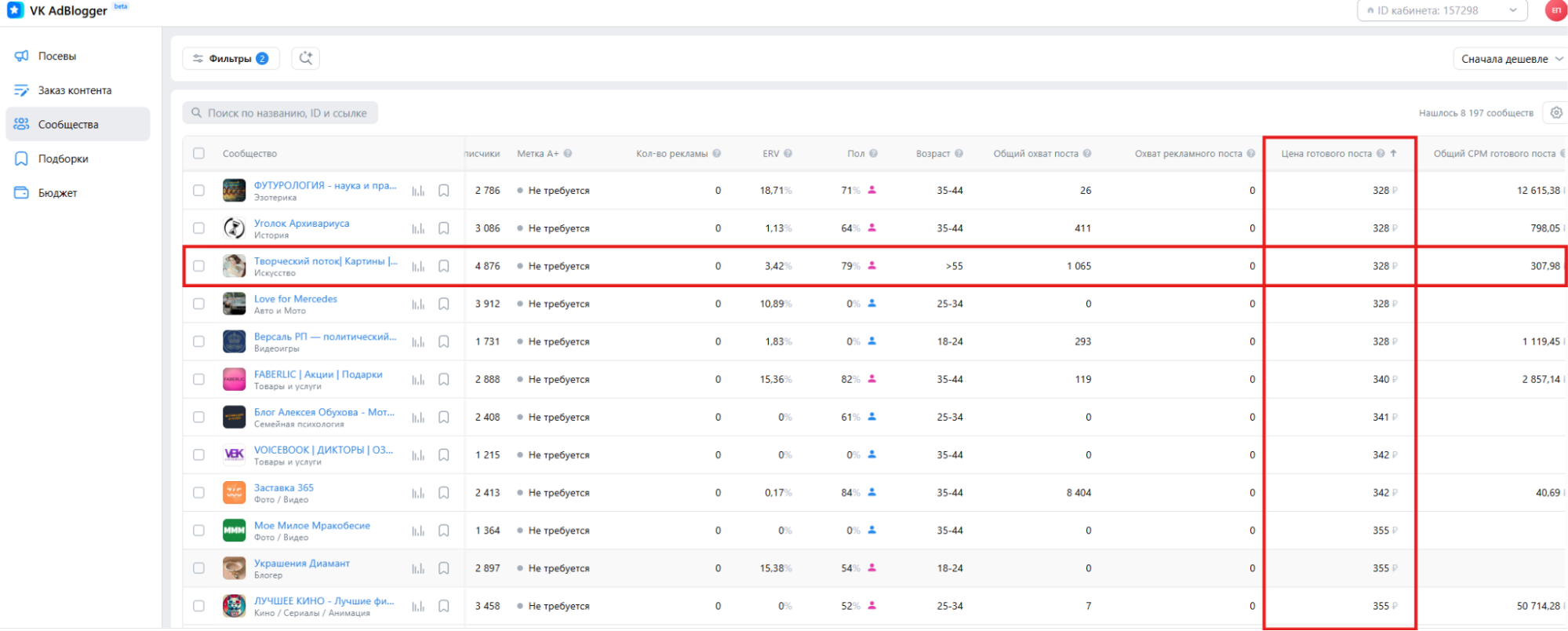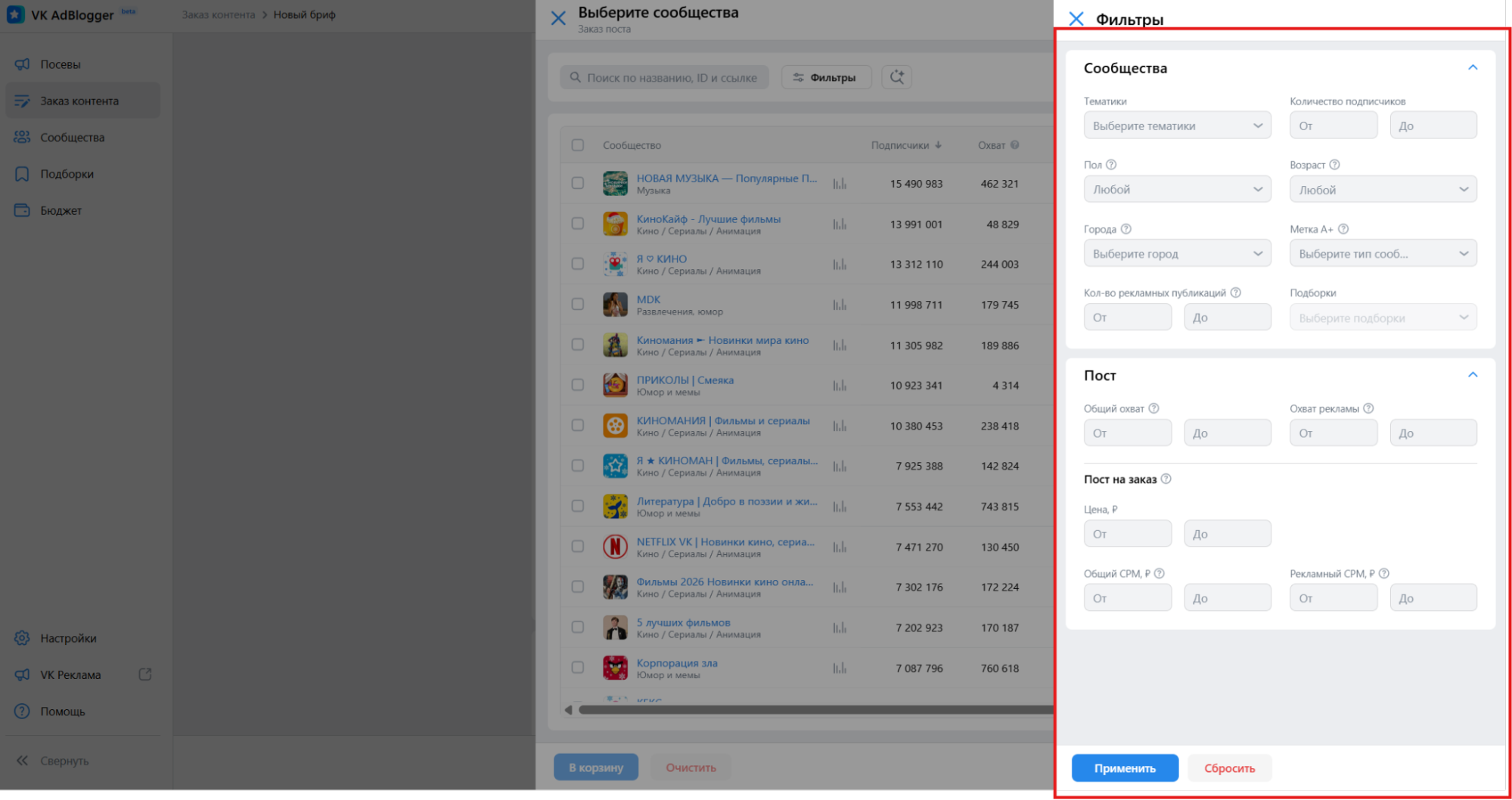 Подбирать сообщества на платформе можно по названию или с использованием фильтров — по тематике, количеству подписчиков, цене за пост, охвату и другим параметрам.