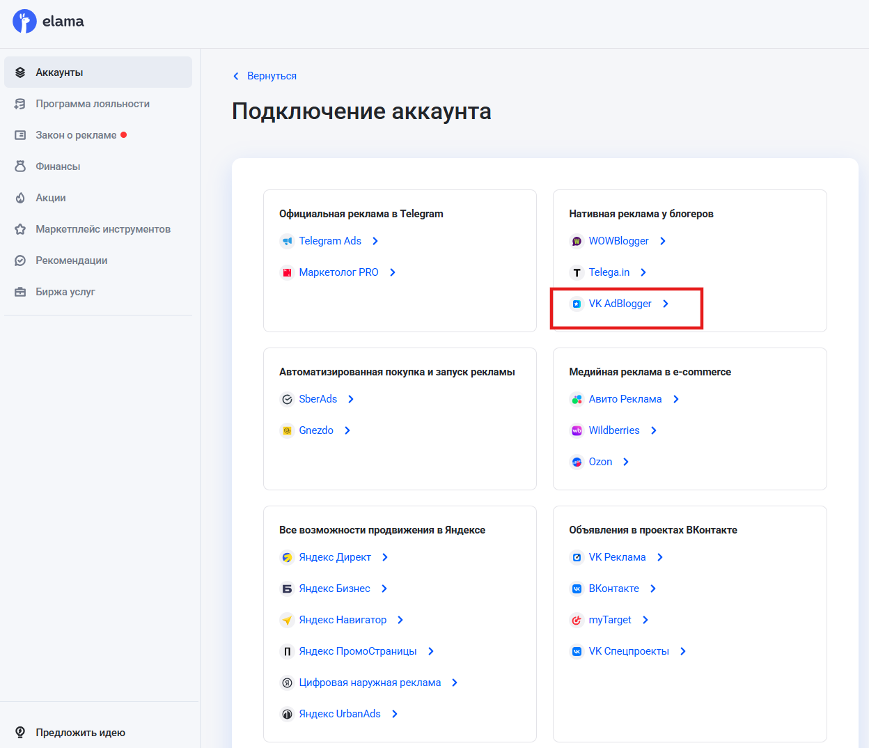 Размещать рекламу на VK AdBlogger можно через eLama.