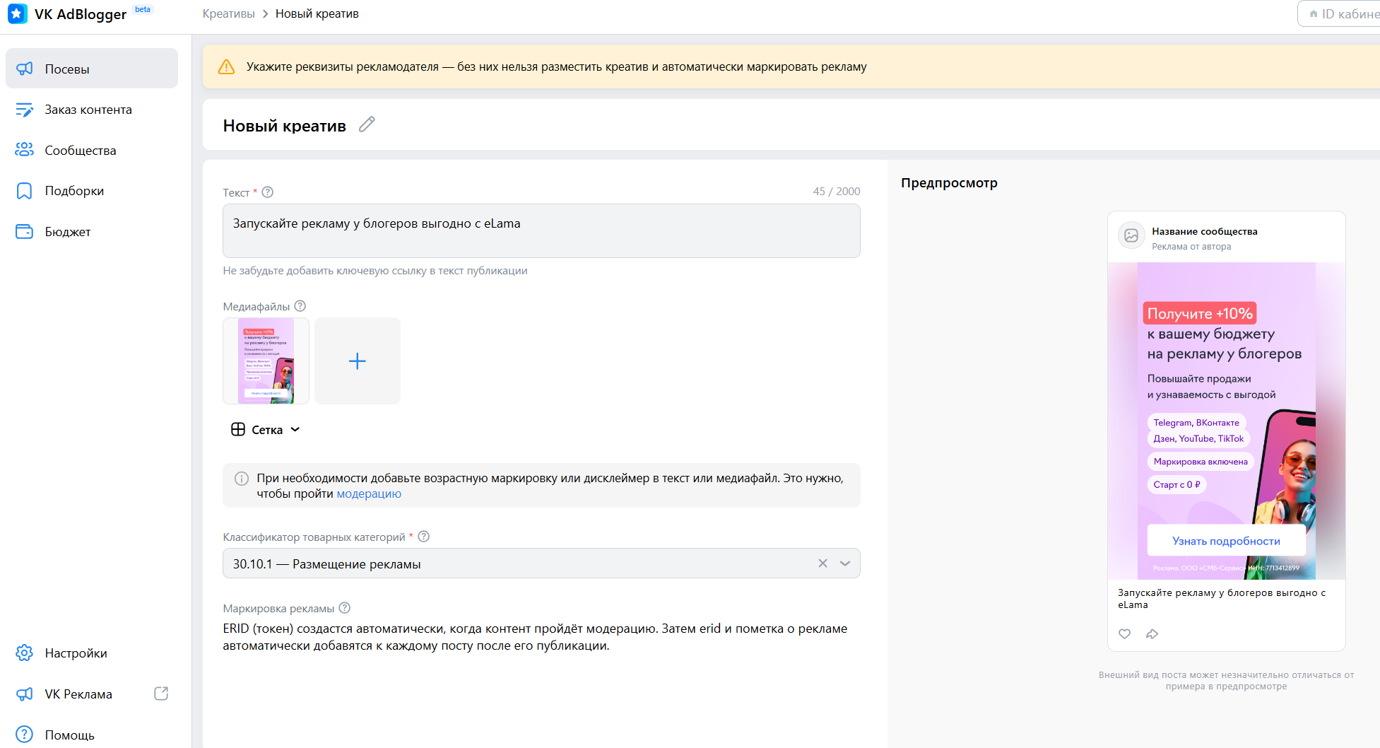 После подключения кабинета рекламодателя потребуется указать реквизиты рекламодателя, без этого не получится размещать и маркировать креативы.