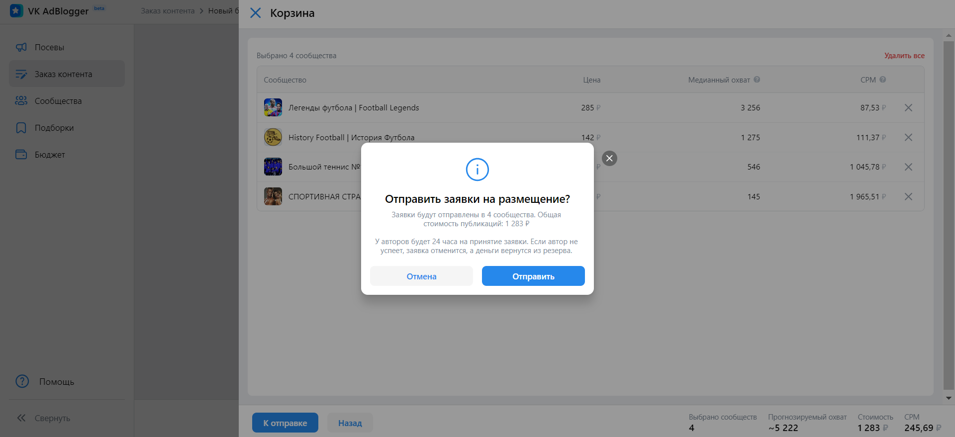 Когда определились с выбором подходящих сообществ, нажимаем кнопку «В корзину», при необходимости редактируем список и отправляем заявки на размещения в выбранные сообщества. Авторы должны принять заявку в течение суток или отменить ее.