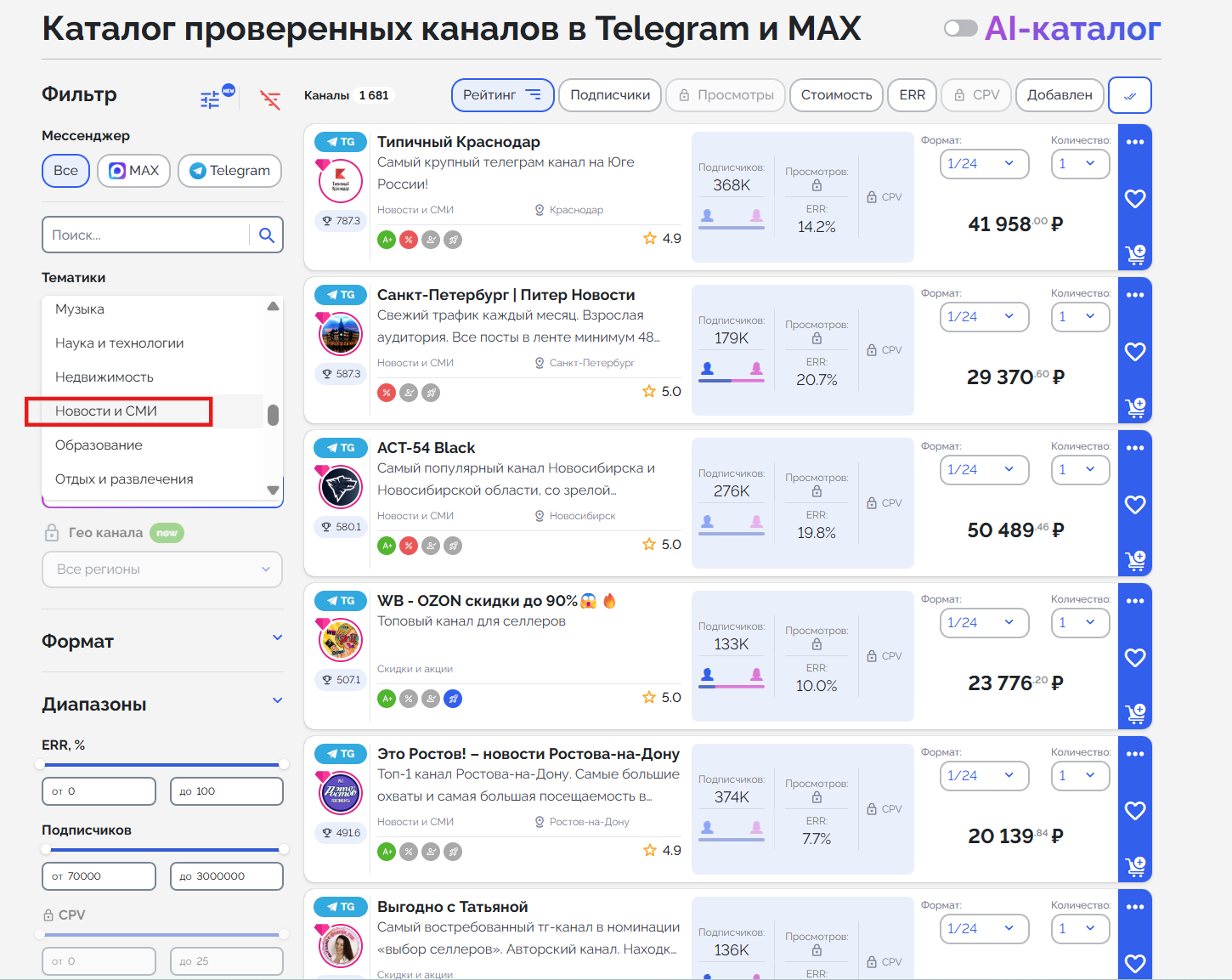 Для подбора каналов и автоматизации процессов использовали сервис Telega.in. В нем за секунды можно отобрать проверенные на отсутствие накрутки и качество каналы по фильтрам. Чтобы достичь максимального эффекта, мы отфильтровали в каталоге каналы:
