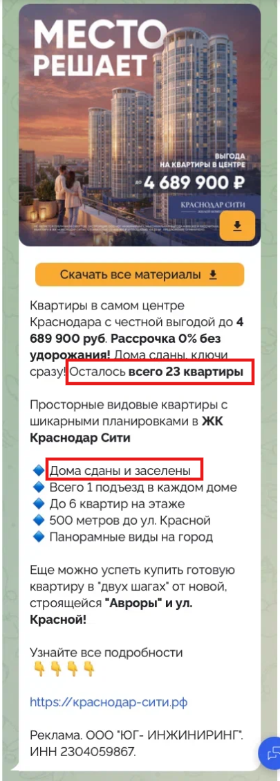 Также мы ограничили предложение и подогревали интерес к нему ощущением дефицита — добавив «осталось 23 квартиры». Это указание количества оставшихся квартир создавало атмосферу востребованности и снимало сомнения в надежности ЖК, которые могли быть вызваны историей со сменой застройщика. Мы также усилили эффект надежности, добавив в рекламный пост тезис о том, что дом уже заселен.